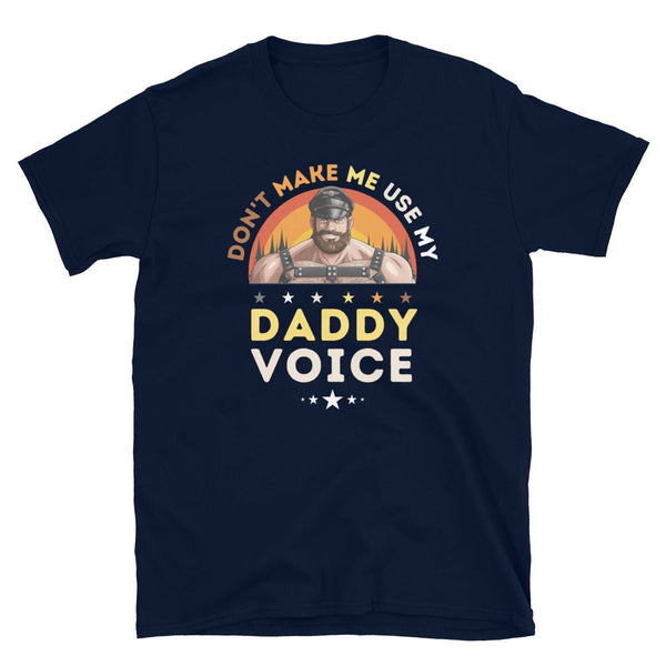 Muscle model in a humorous gay shirt featuring a daddy voice quote.